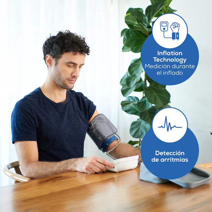 Medición de la presión arterial rápida y suave, ya durante el inflado gracias a la Inflation Technology. La Bluetooth® low energy technology integrada y la pantalla XL con retroiluminación blanca, lo convierten en un tensiómetro cómodo para su uso en el hogar.